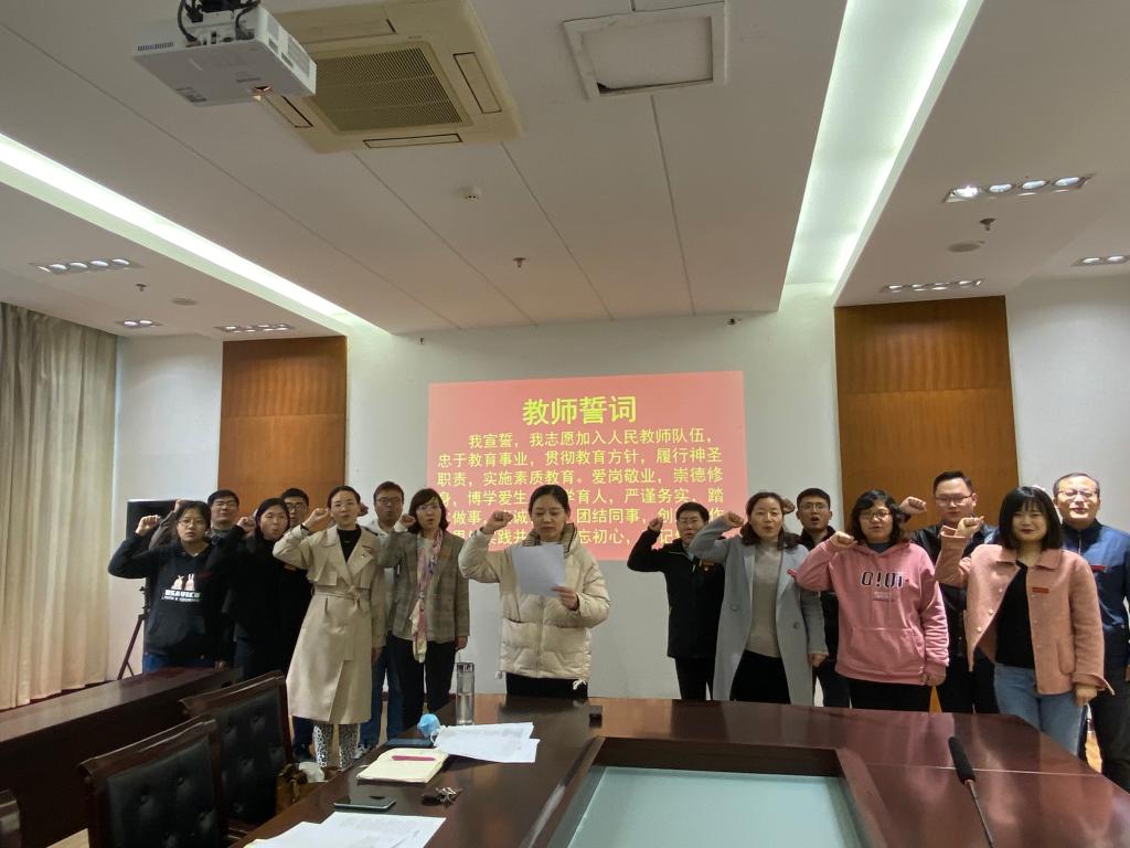 会议议程主要分为四个方面:一是陈立娥介绍学校《关于推进2020-2021学年第二学期师德师风专项督查行动的通知》(苏农林委宣〔2021〕4号)及其行动实施方案;二是思政教研室主任王涛领学教育部等七部门印发的《关于加强和改进新时代师德师风建设的意见》(教师〔2019〕10号);三是举行宣誓仪式,由校级师德标兵丁志春老师带领参会教师重温教师宣誓誓词;四是教师签订“师德承诺书”。