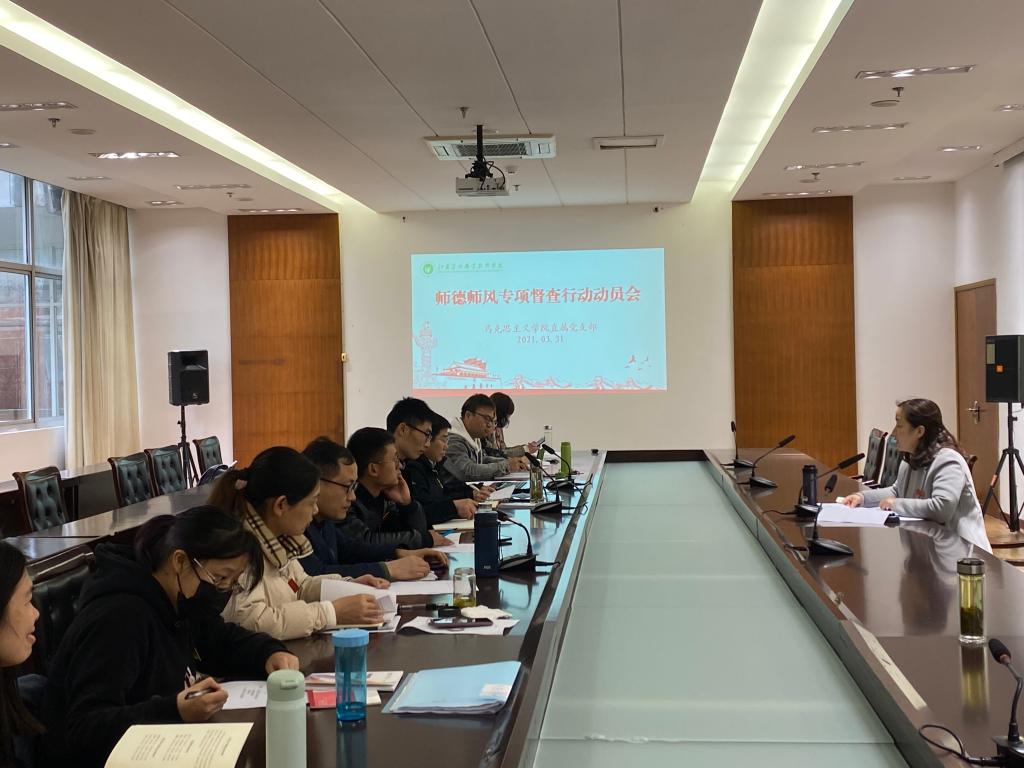 3月31日下午,马克思主义学院召开师德师风专项督查行动动员会,本次会议由马克思主义学院副院长陈立娥主持,学院思政教师参加会议。