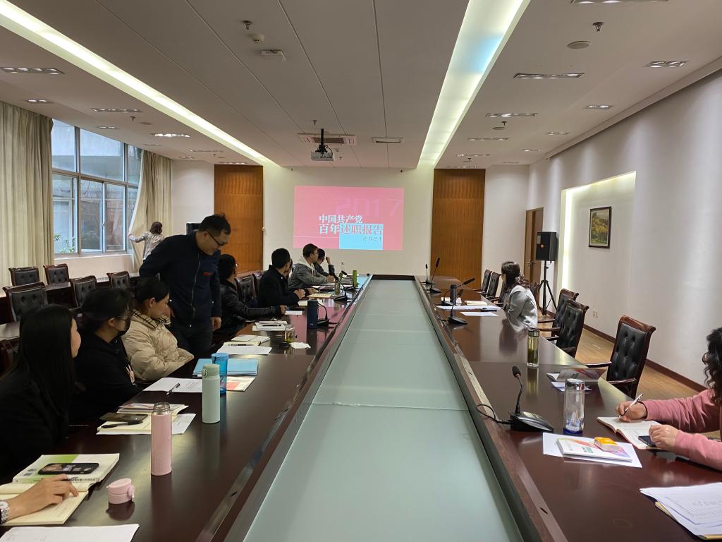 会议议程分为两个方面:首先,陈立娥带领与会人员学习学校党委书记巫建华在全校党史学习教育动员会议上的讲话内容,从三个方面深入领会党史学习教育的重大意义。随后,与会人员集体观看视频《中国共产党百年述职报告》,并发表学习感悟。