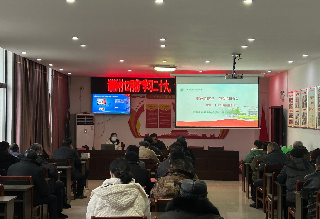 12月16日上午,马克思主义学院副院长陈立娥在句容市郭庄镇谢桥村党群服务中心为村干部和党员近80多人开展题为《奋进新征程建功新时代——党的二十大精神解读》理论宣讲。