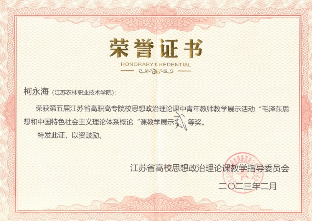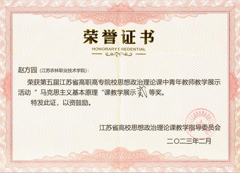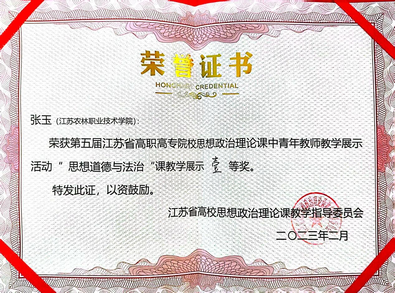 本次教学展示活动选拔赛启动于2022年11月份,由省高校思政课教指委各分课程教指委组织。马克思主义学院选派教师参加了第五届江苏省高职高专思想政治理论课中青年教师教学展示活动各组别的选拔赛。其中,张玉老师获得高职高专德法组一等奖、柯永海老师获得概论组二等奖、赵方园老师获得马原组二等奖。张玉老师被省教指委推荐参加江苏省第二届高校思政课教学展示活动的决赛,最终获得高职高专德法组一等奖的好成绩。