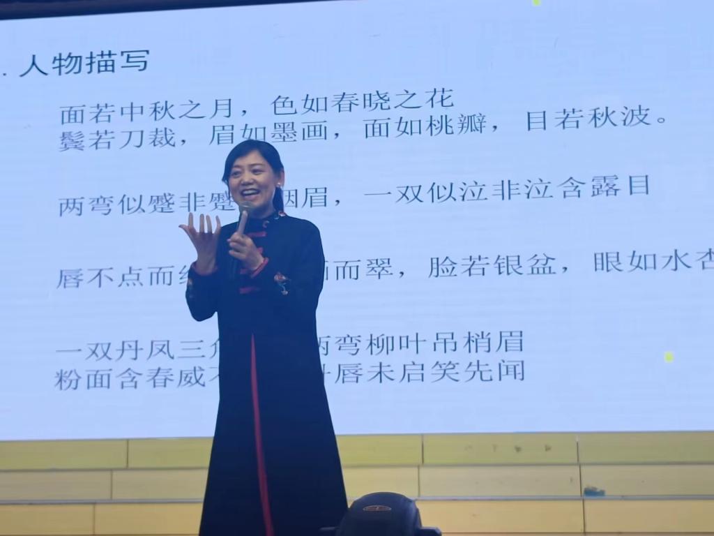 活动中,丁志春以“说唱红楼——跟着红楼学写作”为主题,围绕文学巨著《红楼梦》中的经典诗词作品,进行了深刻的解读赏析。主要讲述了林黛玉进贾府、黛玉葬花和贾宝玉到潇湘馆哭灵三个故事,结合三段经典唱段《天上掉下个林妹妹》《黛玉葬花》和《问紫娟》,全方位呈现了红楼诗词与故事情节相结合的独特写作手法。现场师生积极参与互动,掌声经久不息。