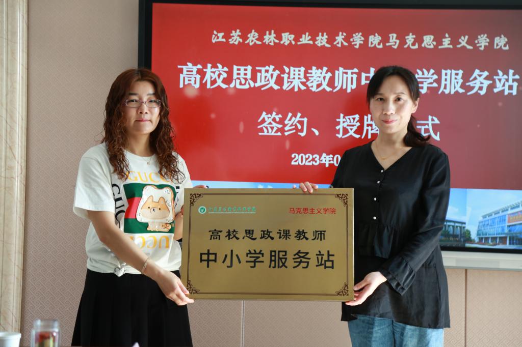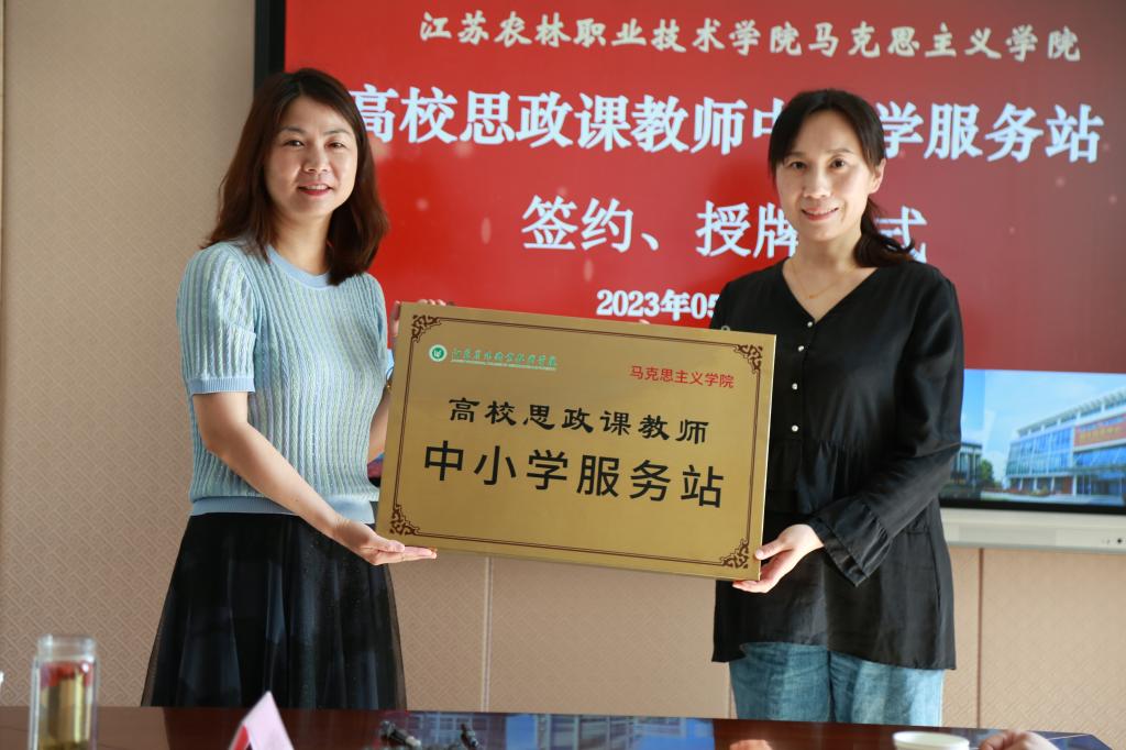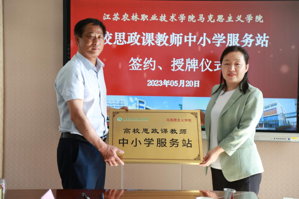 为切实推进句容市大中小学思政课一体化建设,落实立德树人根本任务,5月20日下午,马克思主义学院与句容市实验高级中学、句容行香中学、句容下蜀中学和句容石狮小学等4所中小学“思政课教师中小学服务站”挂牌签约活动在句容市实验高级中学举行。我院党总支副书记李杨、副院长陈立娥及签约合作学校的校长出席签约仪式。