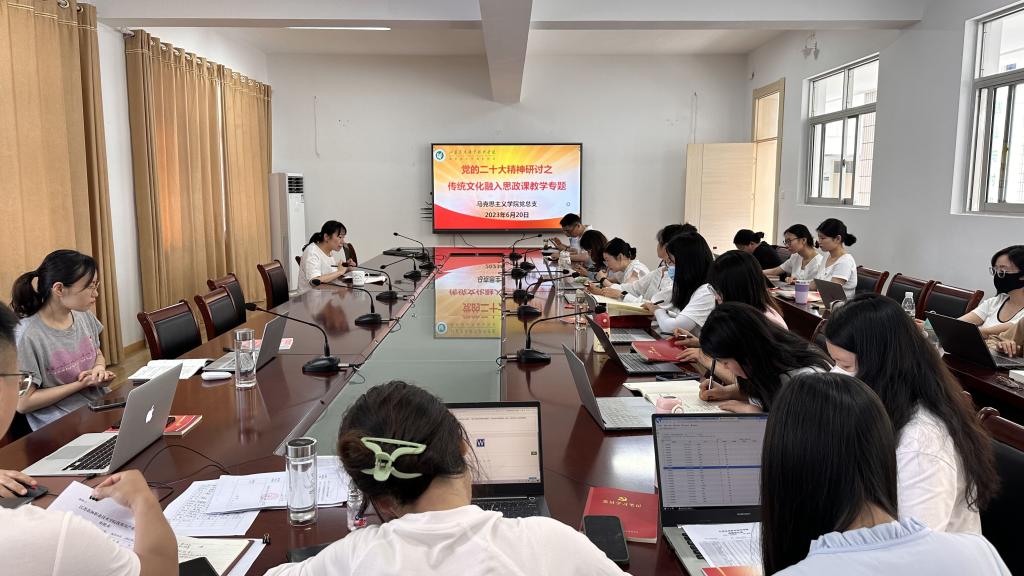 为进一步深入学习党的二十大精神,推动党的二十大精神进教材、进课堂、进学生头脑,6月20日上午,马克思主义学院在创客314会议室开展党的二十大精神之传统文化融入思政课教学专题研讨会。会议由党总支副书记李杨同志主持,各支部书记、支委和党员同志参加会议。