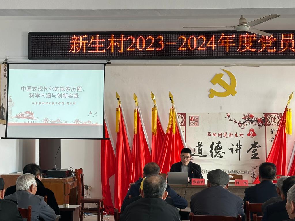 3月22日下午,马克思主义学院张春明老师受邀前往华阳街道新生村开展理论宣讲。宣讲活动由新生村党总支书记陈杰主持,新生村40余名党员参加了活动。
