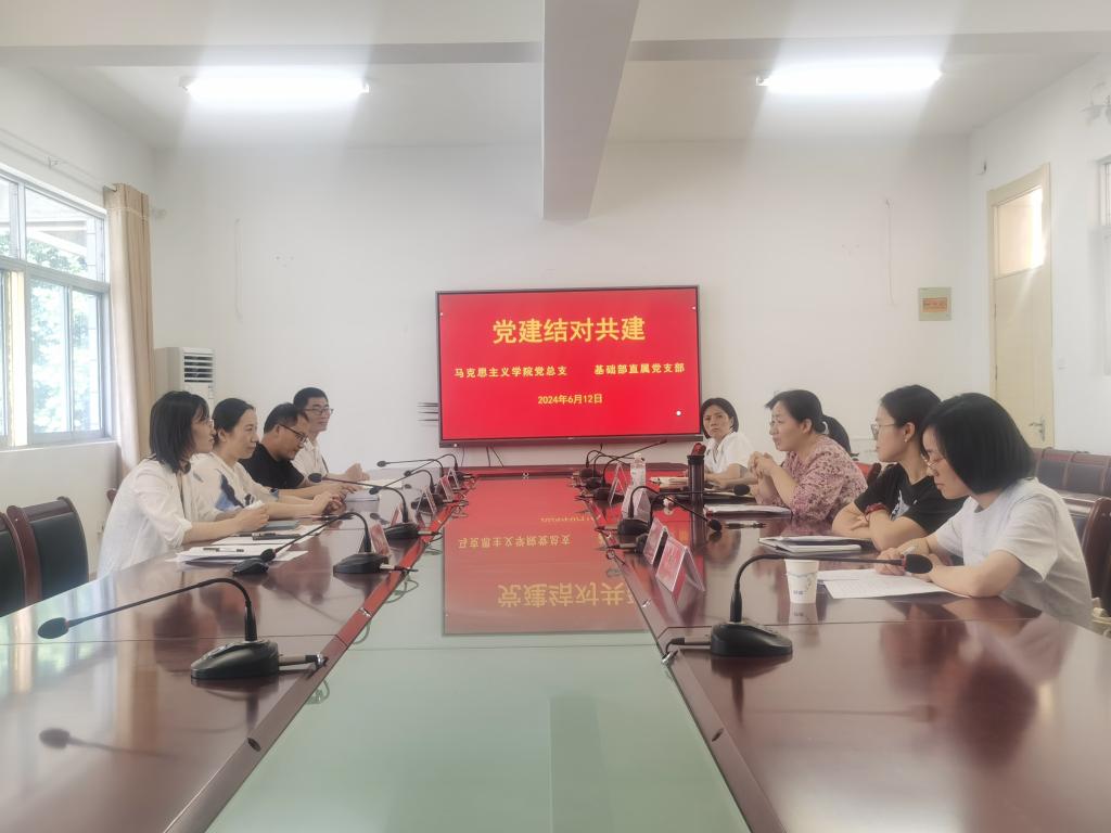 6月12日下午,马克思主义学院党总支与基础部直属党支部在创客314会议室开展结对共建活动。马克思主义学院党总支书记李杨、基础部直属党支部书记陈立娥及双方党员代表参加结对共建活动。李杨同志和陈立娥同志在“思想建设互联、组织建设互促、党员干部互动、党建载体互用、文化建设互通”等方面深入交流,共同谋划合作事宜。