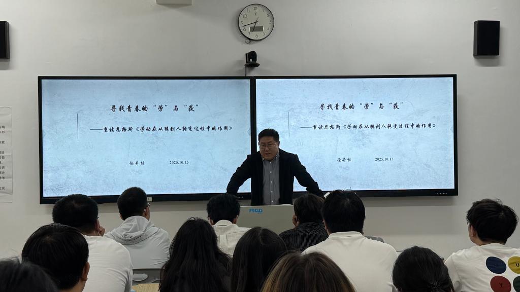 活动由赵荣老师主持,徐井柱、李娜老师担任主讲嘉宾,带领学生精读经典文本,深入阐释“劳动创造了人本身”的哲学内涵与现实意义。两位教师结合自身研究,分享了阅读心得,引导学生从经典中汲取智慧,反思当代青年的劳动实践与成长路径。