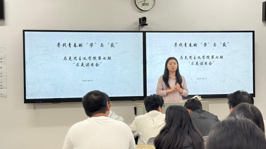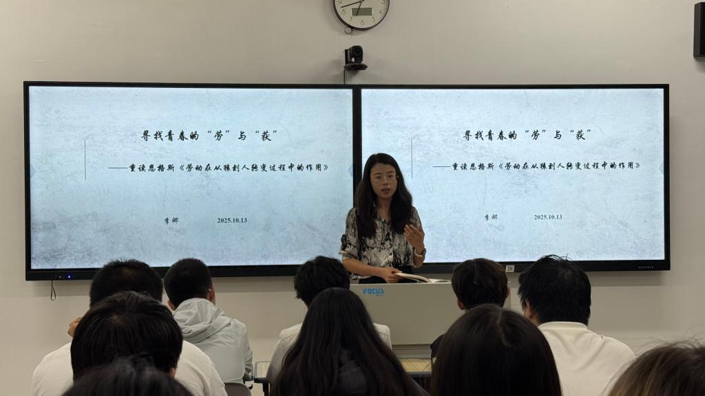 2025年10月13日,马克思主义学院主办的第七期求是读书会在创客空间四楼401教室顺利举行。本次活动由李娜老师组织,活动以“寻找青春的‘劳’与‘获’——重读恩格斯《劳动在从猿到人转变过程中的作用》”为主题,共有15名学生参与。
