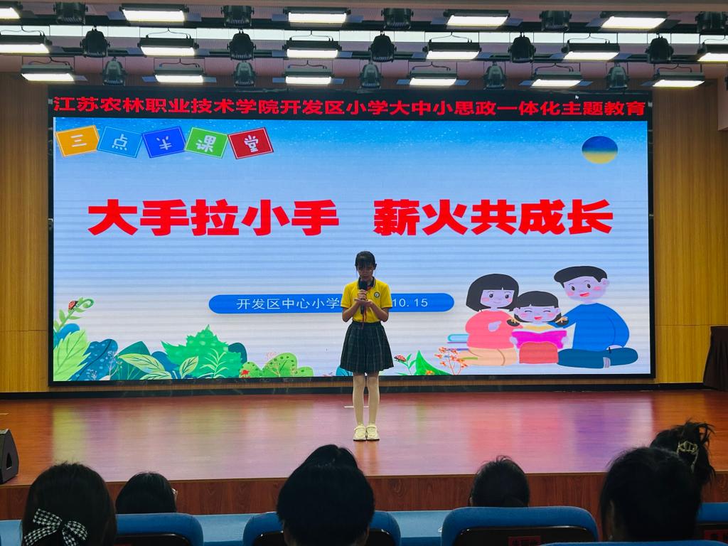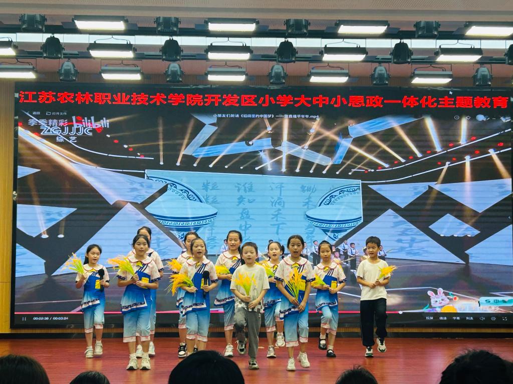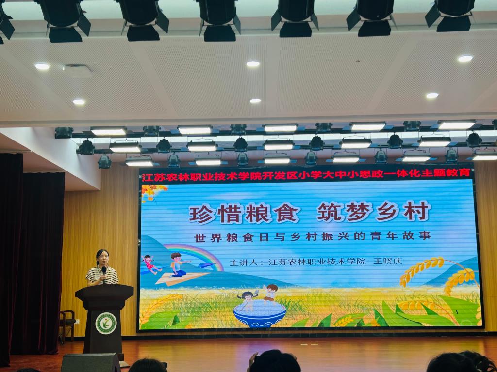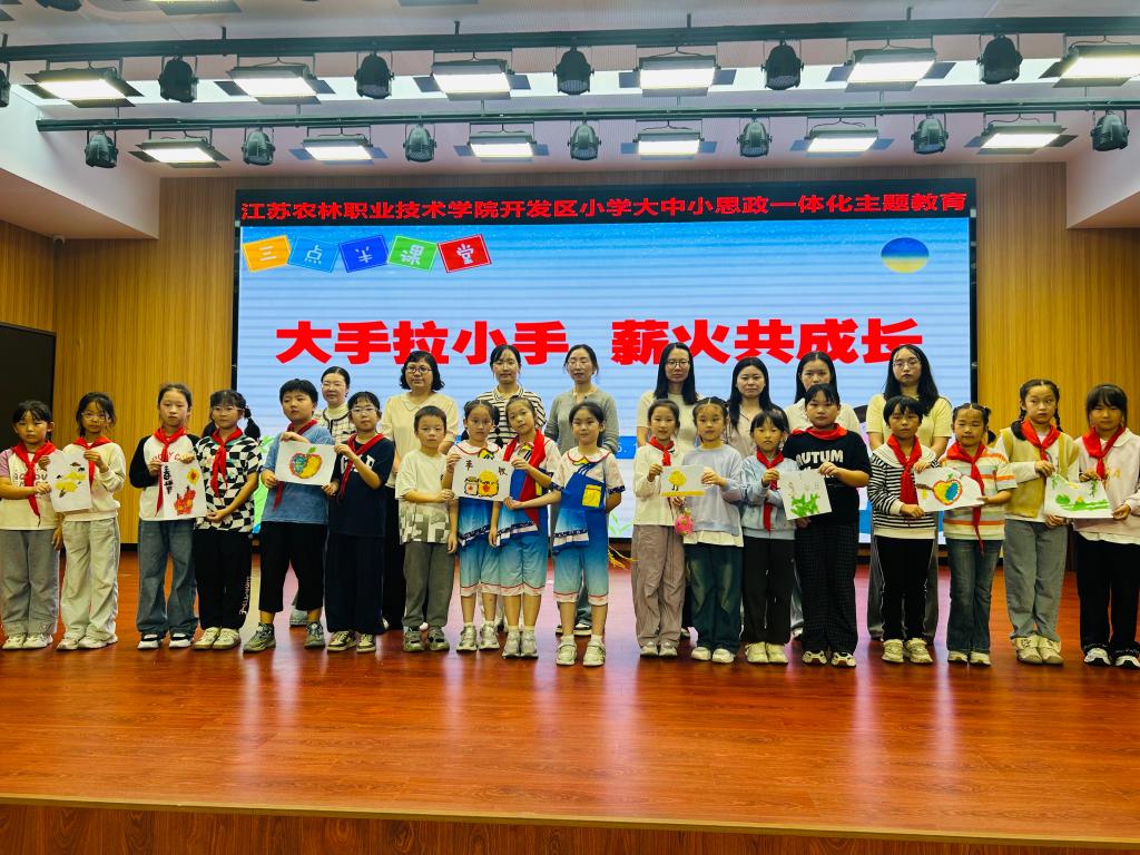 在第45个世界粮食日到来之际,10月15日,江苏农林职业技术学院马克思主义学院毛泽东思想和中国特色社会主义理论体系概论教研室党支部,携手句容市开发区中心小学共同举办“大手拉小手,薪火共成长”大中小思政一体化主题教育活动。马院师生代表、句容市开发区中心小学三年级学生及党员教师代表等200余人齐聚一堂,通过大学生与小学生的互动协作,搭建思政教育一体化实践桥梁。